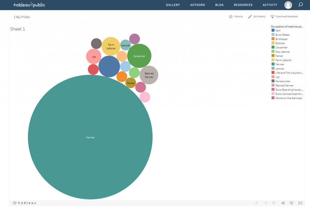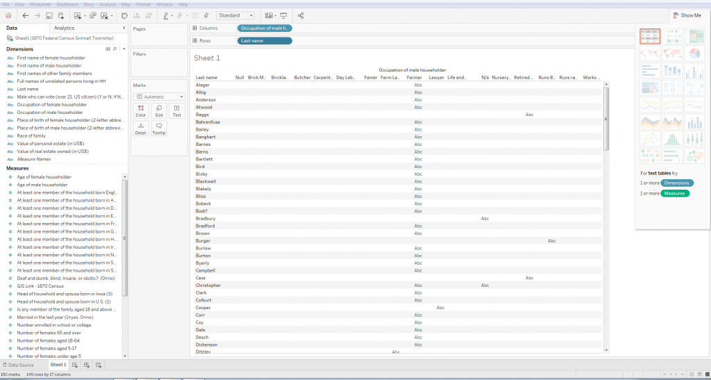 22-Tableau’s default visualization is a table that shows where last names and occupations intersect in the data.