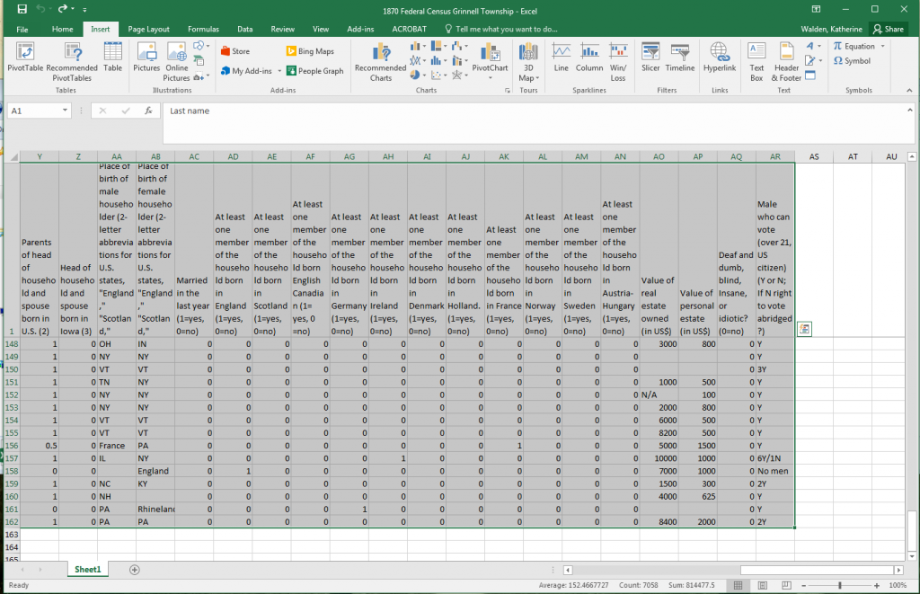 We’ll use the same 1870 Federal Census Grinnell Township file to build preliminary data visualizations in Microsoft Excel. Navigate to http://vivero.sites.grinnell.edu/files/ in a browser if you need to download the file again.